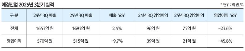 애경산업(대표 김상준)은 연결 기준 3분기 매출액 1,693억 원, 영업이익 73억 원을 기록했다. 전년 동기 대비 매출은 2.4% 증가했으나, 영업이익은 23.6% 감소했다. 3분기 누적 연결 기준 실적은 매출 4,916억 원, 영업이익 245억 원으로, 전년 동기 대비 각각 3.2%, 43.7% 감소했다.