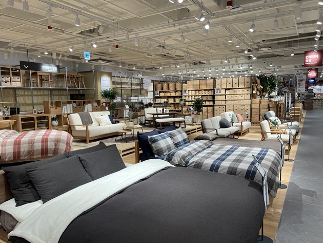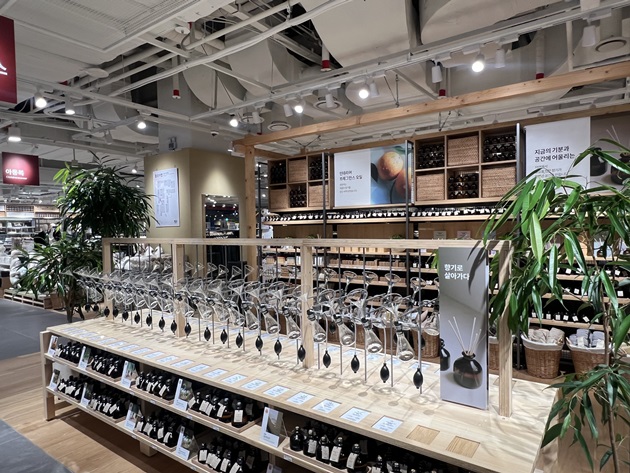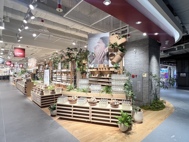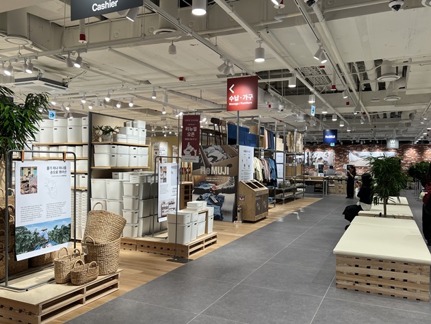 서울 최대 규모로 리뉴얼 오픈한 무인양품 용산 아이파크몰점은 의복, 생활잡화, 식품, MUJIALBO(무지라보) 등 다양한 상품을 한 공간에서 선보인다. 커피 자판기와 휴게 공간을 마련해 편안한 쇼핑 환경을 조성했고 친환경 철학을 반영한 ReMUJI 공간을 신설해 오랜 시간 사랑받은 의류를 재활용해 새로운 상품으로 재탄생시키는 자원 순환 프로젝트를 선보였다. 매장 곳곳에는 폐교 마루를 활용한 인테리어와 팝업스토어에서 사용했던 프리저브드 식물 재활용 등 지속가능성과 친환경 가치를 체험할 수 있는 요소들이 배치됐다.
