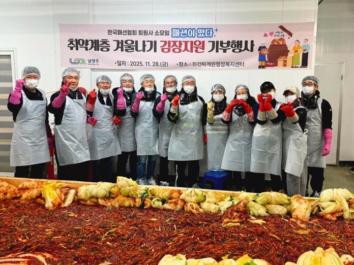 한국패션협회(회장 성래은) 회원사 소그룹 모임 ‘패션이 떴다’(이하 ‘패떴’)가 남양주 시 진건퇴계원행정복지센터에서 11월 28일 김장 김치 1,000포기를 직접 담가 취약계층 가구에 전달했다.