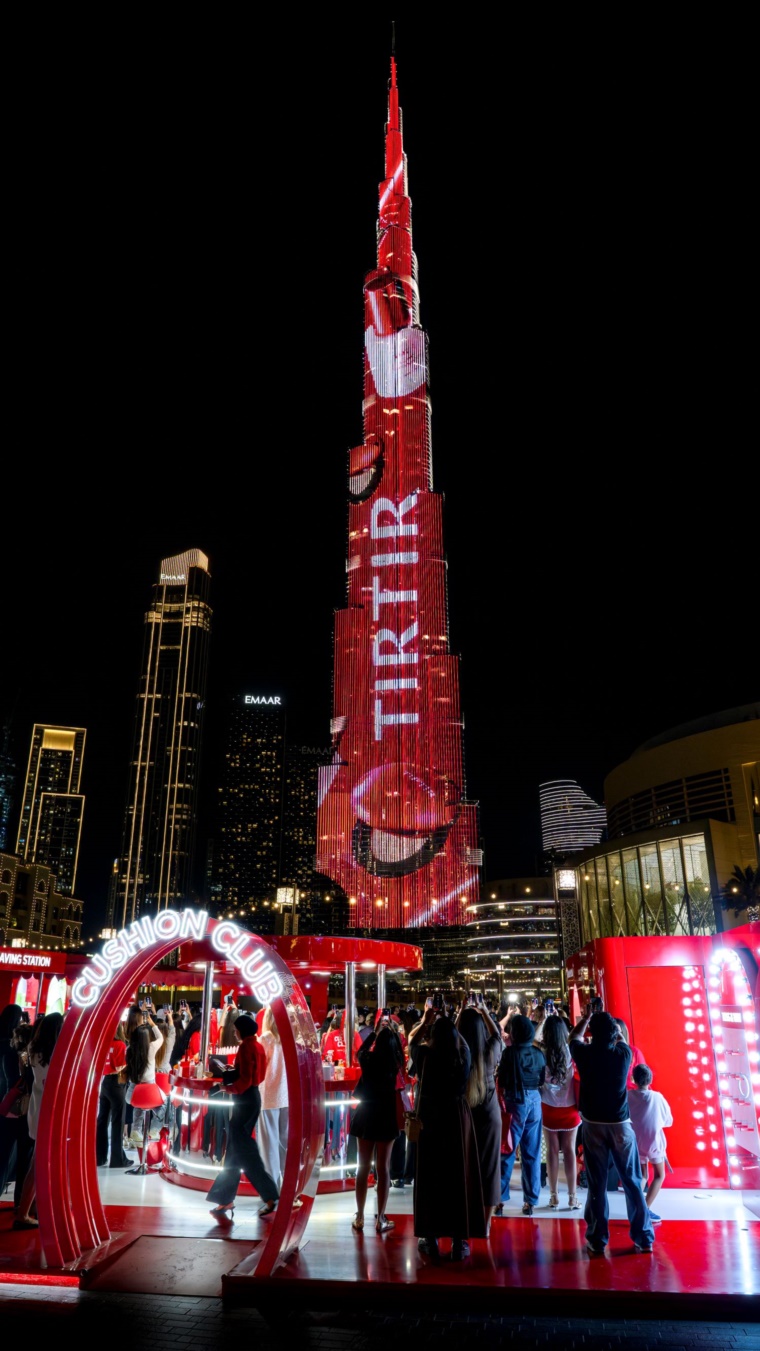 이번 행사에서는 세계에서 가장 높은 건축물인 부르즈 할리파(Burj Khalifa)가 티르티르의 브랜드 아이덴티티로 화려하게 물들었다. 지하 2층부터 지상 163층까지 이어지는 초고층 건물의 미디어 파사드를 통해 브랜드 시그니처 컬러와 메시지가 강렬하게 표현되며, 글로벌 도시 한복판에서 티르티르의 존재감을 확실히 각인시켰다.