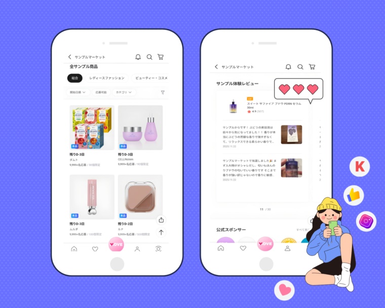 샘플마켓은 고객이 ‘써보고 싶다’고 응모하면 추첨을 통해 무료 체험 기회를 제공하는 서비스다. 누적 응모수만 1억건이 넘는 큐탠재팬 대표 서비스로, 소비자들은 평소 관심이 있던 상품이나 신상품을 직접 사용해볼 기회를 얻을 수 있고, 셀러들은 리뷰 작성 유도와 고객 유입, 인지도 제고, 매출 상승까지 기대할 수 있다.