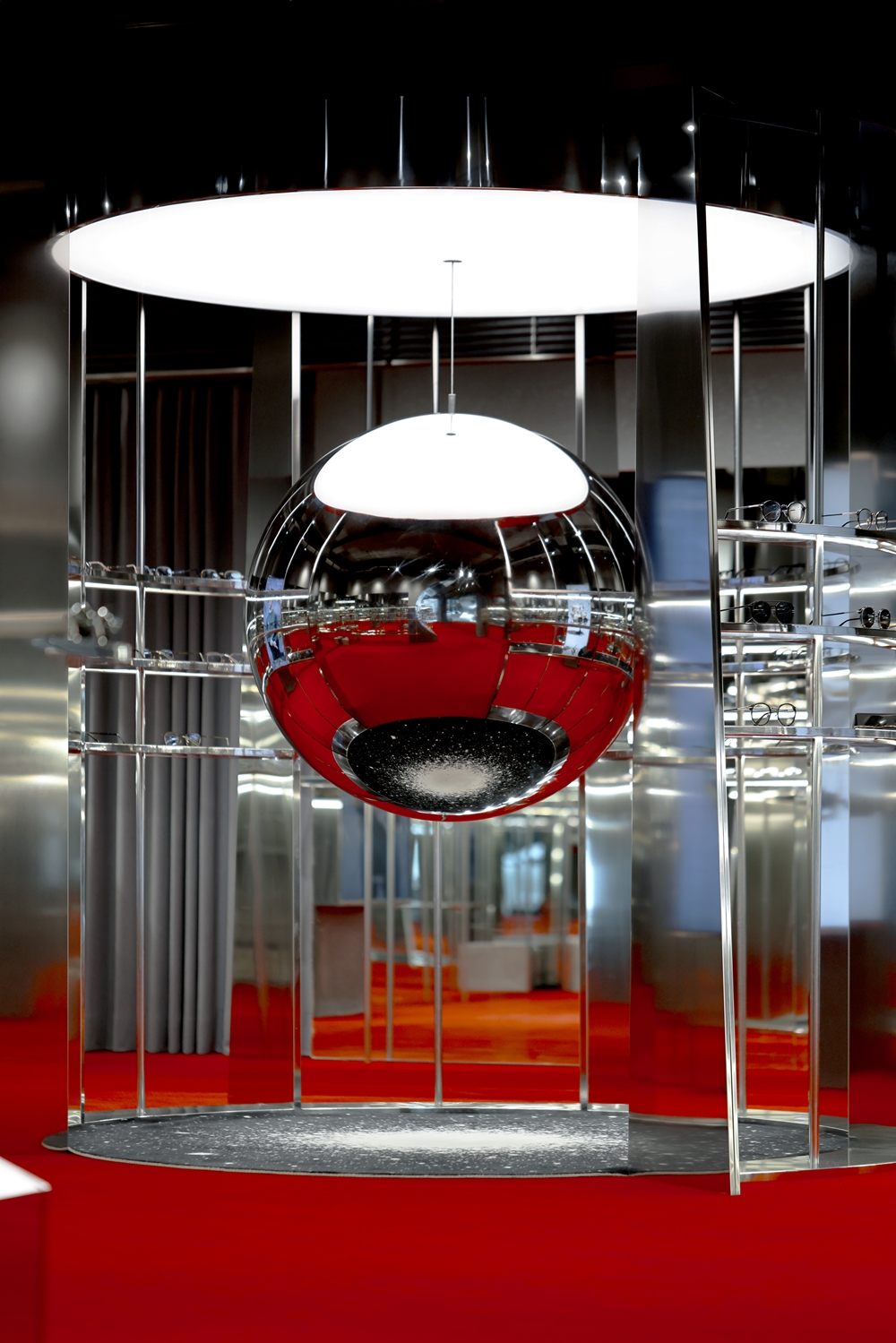 공간의 중심에는 행성을 연상시키는 금속 구형 오브제가 배치돼 미래적인 분위기를 연출하고, 이곳을 중심으로 다양한 아이웨어가 별처럼 빛나는 조형적 전시를 이뤄낸다. 마치 시공간이 살짝 비틀려 있는 듯한 메탈릭 무드 속에서 마노모스의 섬세한 디자인이 한층 강조되며, 고객이 단순한 쇼핑을 넘어 ‘새로운 세계를 탐험하는 경험’을 느낄 수 있도록 구성됐다.