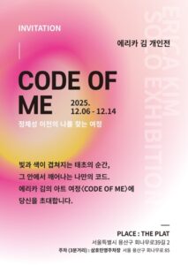 아티스트 에리카 킴이 개인전을 연다. ‘CODE OF ME(정체성 이전의 나를 찾는 여정)’라는 주제로 열리는 이번 전시는 서울 용산구에 위치한 ‘THE PLAT’에서 열리며 전시 기간은 12월 6일 부터 시작해 14일까지다.