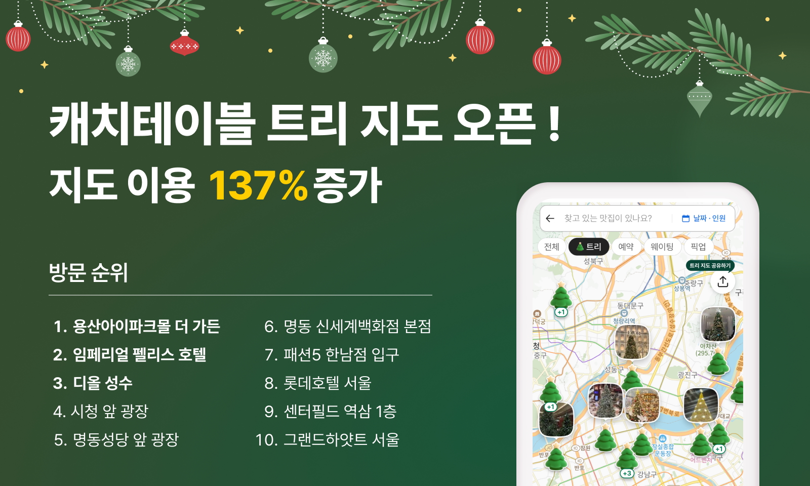 크리스마스 트리 지도는 캐치테이블 이용자들의 자발적인 제보와 내부 구성원들의 현장 수집을 통해 완성됐다. 지도에는 용산아이파크몰 더 가든, 임페리얼 펠리스 호텔, 디올 성수, 시청 앞 광장, 명동성당 앞 광장, 명동 신세계백화점 본점, 패션5 한남점 입구, 롯데호텔서울, 센터필드 역삼 1층, 그랜드하얏트 서울 등 연말 시즌 시민들이 즐겨 찾는 트리 명소들이 포함됐다.