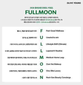 CJ올리브영(이하 올리브영, 대표 이선정)이 올해와 내년 K뷰티와 웰니스(Wellness) 산업을 관통하는 핵심 키워드로 ‘F.U.L.L.M.O.O.N(보름달)’을 선정하고, 8가지 세부 트렌드를 소개하는 ‘2026 트렌드 키워드’ 리포트를 발간했다. 올해는 전반적인 트렌드 흐름 속에서 ‘온전한 나’를 추구하는 움직임이 두드러졌다.