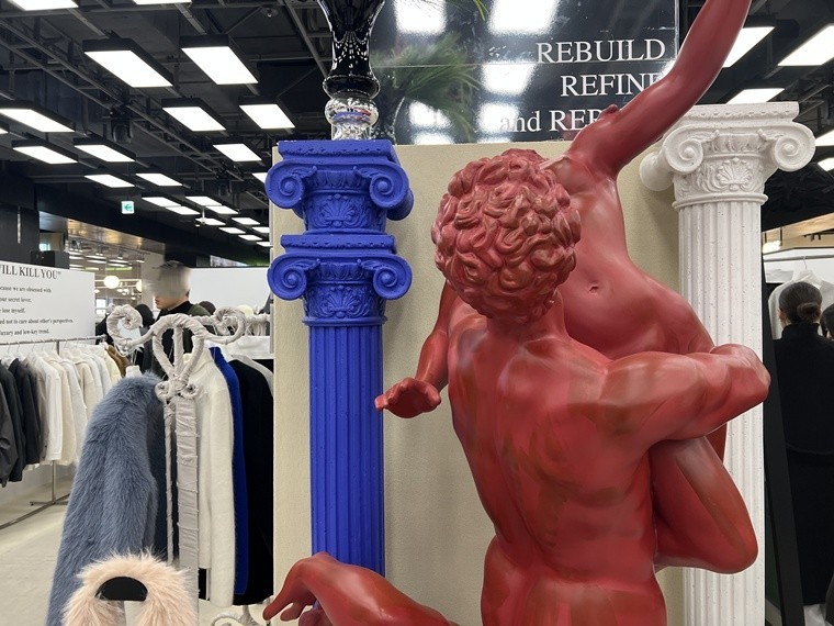 공간 구성 역시 브랜드의 정체성인 ‘리빌드, 리파인(Rebuild, Refine)’을 시각적으로 극대화했다. 유럽풍 조각상을 동양적으로 재해석한 오브제와 철제 구조물을 배치해 과거와 현재, 동서양의 경계를 허무는 브랜드의 예술적 감도를 전달했다. 이준복 대표는 “서양 복식의 토대 위에 동양적 감성을 정제해 담아내는 것이 리이의 지향점”이라며 “이번 팝업 공간은 이러한 브랜드의 모습을 고객이 직접 경험하는 데 초점을 맞췄다”고 전했다.