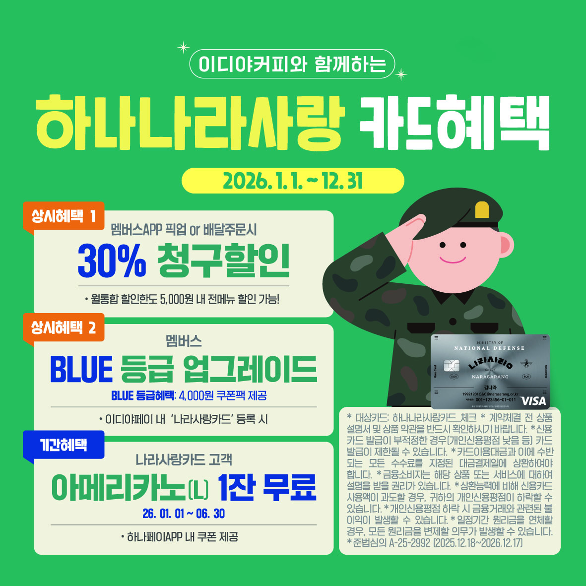 이디야커피(대표 조규동 문찬기)가 2026년 1월 1일부터 12월 31일까지 하나은행 ‘나라사랑카드’와 연계한 마케팅 협업을 진행한다.