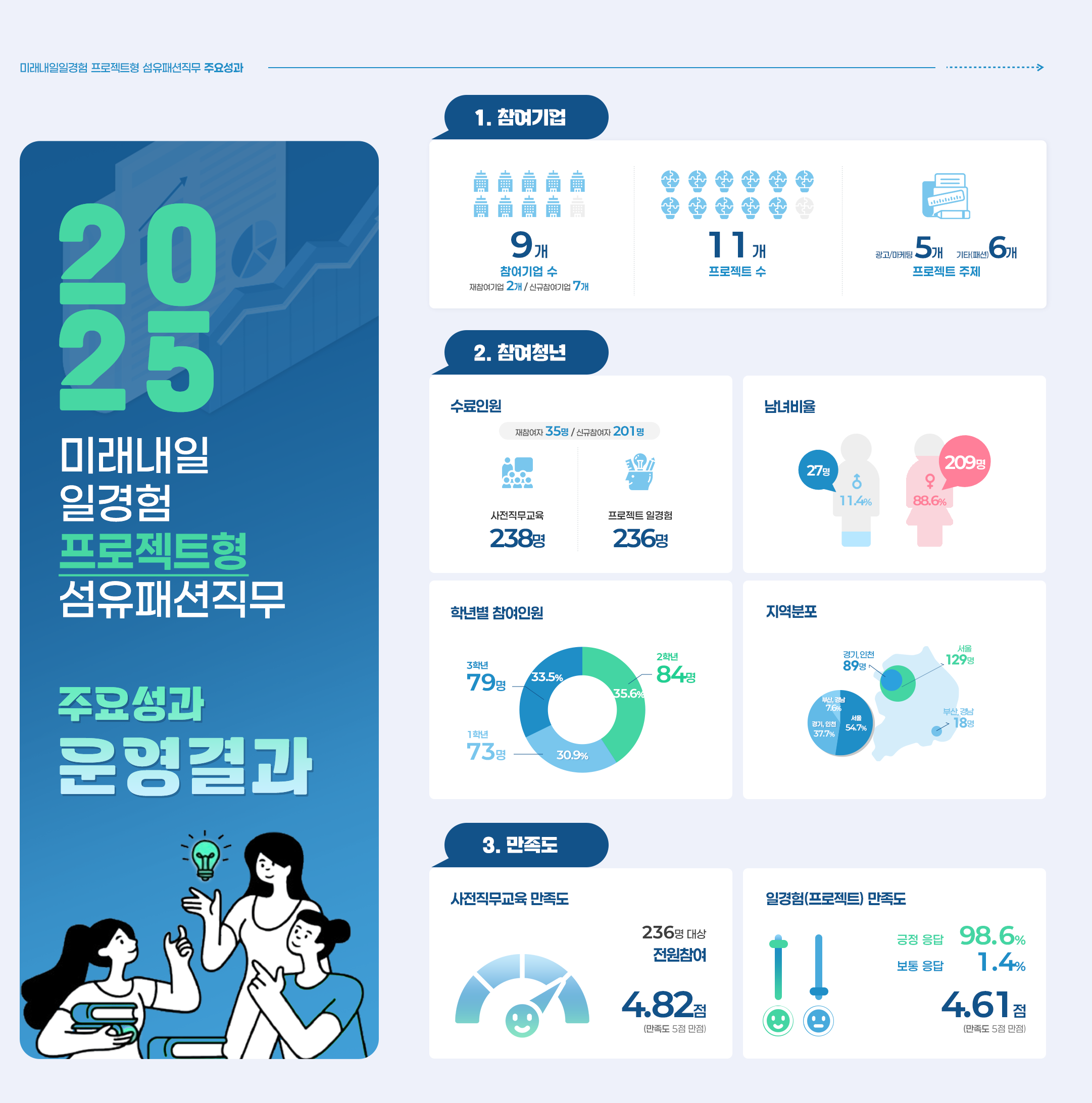 이번 사업은 패션 및 유통 분야에 특화된 실전 비즈니스 모델을 구축하는 데 집중했다. 9개 참여 기업이 제안한 실제 현장 과제를 수행하기 위해 236명의 청년이 투입되었으며, 총 11개의 프로젝트(광고·마케팅 5개, 패션 직무 6개)를 성공적으로 마무리하며 현장 적응력을 입증했다.