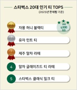 2위는 ‘유자 민트 티’가 차지했다. 유자 민트 티는 전통적인 차 재료인 유자를 활용한 색다른 민트 티다. 3위와 4위는 말차 인기에 힘입어 ‘제주 말차 라떼’, ‘말차 글레이즈드 티 라떼(시즌 종료)’가 각각 이름을 올렸다.