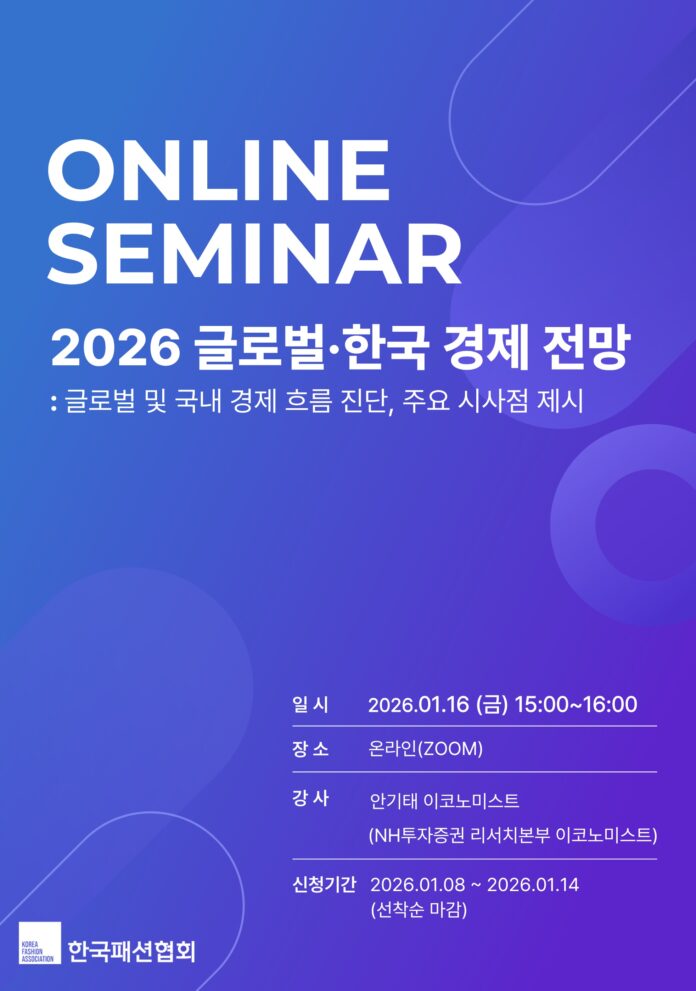 한국패션협회(회장 성래은)가 2026년 새해를 맞아 글로벌 거시 경제와 국내 시장의 흐름을 심층 진단하는 온라인 세미나를 ‘2026 글로벌 및 한국 경제 전망 진단’이라는 주제로 개최한다. 이번 세미나는 급변하는 대내외 경영 환경 속에서 패션 산업이 나아가야 할 방향을 모색하고 기업들의 전략 수립을 지원하기 위해 마련되었다.