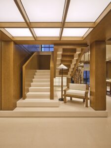 천장에는 한지에서 영감을 받은 조명을 설치해 공간 전체를 부드럽고 은은한 빛으로 채웠고, 맞춤 제작한 목제 가구와 낮은 좌석을 배치해 방문 고객들이 편안하게 머물다 갈 수 있도록 배려했다.