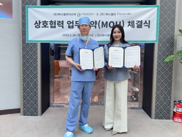 바이오 소재 및 세포치료제 연구개발 기업 파나셀바이오텍(대표 최승호)이 줄기세포 기반 뷰티 전문 기업 파나셀라(대표 김미주)와 엑소좀 활용 제품 및 관련 사업 협력을 위한 업무협약(MOU)을 1월 27일 체결했다.