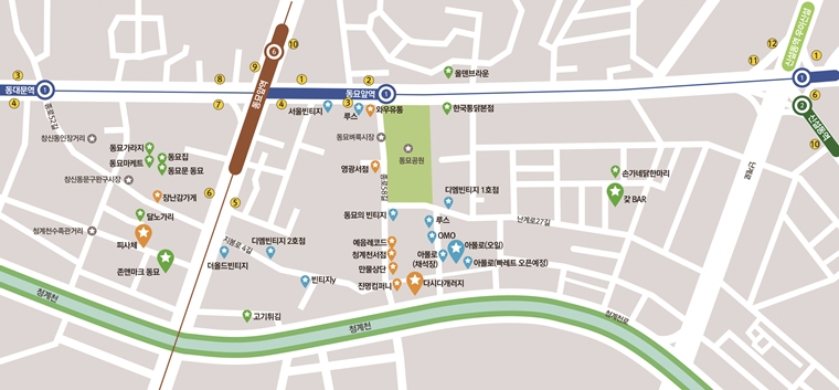 동묘상권이 타 상권과 결정적으로 다른 점은 여러 거리와 시장이 합쳐진 복합상권이라는 특성이다. 서쪽 동대문역(청계6가) 방면에는 창신동 인장거리, 문구완구시장거리, 청계천 수족관거리가 형성돼 있고, 동묘역 인근에는 동묘 벼룩시장, 빈티지 시장, 골동품거리가 펼쳐진다. 그리고 신설동역 방면으로 가면 가죽피혁과 풍물시장거리가 자리 잡고 있다.