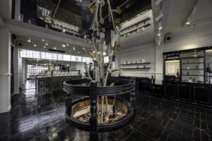 ‘꽃(Flower)’을 테마로 1층부터 3층까지 관통하는 중정을 설계해 개방감을 극대화했으며, 매장 중앙에는 실버 메탈 줄기와 크리스탈 꽃으로 구성된 대형 설치 미술 오브제를 배치해 브랜드의 정체성을 시각화했다.