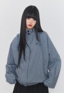 ‘오블리크 프릴 후드 재킷’은 체크 패턴이 돋보이는 하이넥 후디와 전면부의 사선 지퍼, 어깨 셔링 디테일로 유니크한 포인트를 주었다. 밑단 스트링과 소매 밴딩으로 취향에 맞는 실루엣 조절이 가능하다