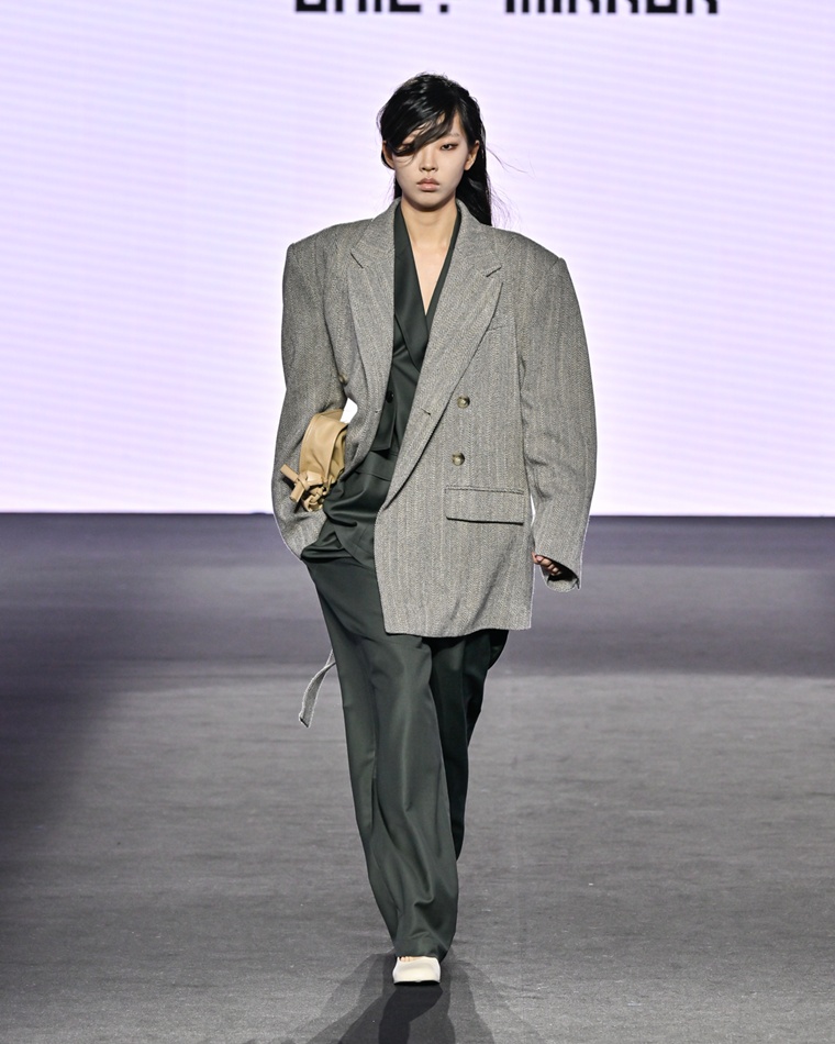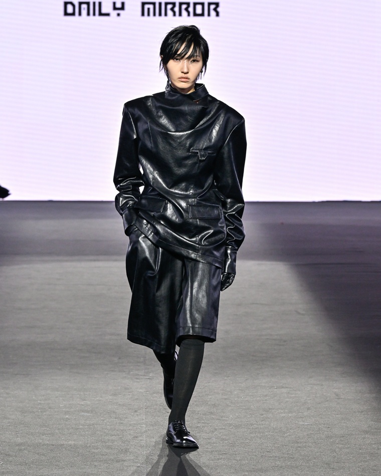 런웨이를 채운 의상들은 데일리미러의 정체성인 ‘Modern · Genderless · Layered’를 완벽하게 구현했다. 어깨 라인을 대담하게 강조한 오버사이즈 테일러링과 직선적으로 길게 떨어지는 롱 코트가 구조적 안정감을 선사하며 컬렉션의 중심축을 형성했다.