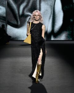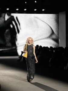 런웨이에서는 시스루 롱 드레스 위에 퍼 텍스처 아우터를 레이어링한 룩이 등장해 시선을 사로잡았으며, 오리지널 패턴이 담긴 드레스는 바디 라인을 따라 유연하게 흐르며 구조적인 실루엣과 부드러운 소재감의 대비를 강조했다. 무채에 가까운 공간 연출 속에서 모델들은 시간이 정지된 공간을 걷는 듯한 장면을 연출하며 고요한 이상향과 정제된 감성을 시각적으로 드러냈다.