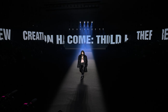 런웨이 시작 전, LED월을 가득 채운 ‘THE OLD HAS GONE, THE NEW IS HERE’의 대형 텍스트 연출은 쇼의 시작과 동시에 시즌 메시지를 직관적으로 전달했다. 버려진 조각과 흔적의 가치를 새롭게 정의한다는 브랜드 철학을 시각적으로 나타낸 것이다.