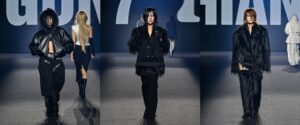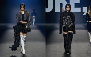 런웨이는 파편화된 재료들이 결합해 새로운 생명체로 거듭나는 과정을 시각적으로 구현했다. 재킷 전면에 장식된 은색의 입체적인 파이핑 디테일과 화려한 스팽글 소재, 퍼(Fur) 부츠가 조화로운 스타일을 만들어 내 시선을 끌었다. 이는 쇼노트에서 언급된 ‘생물학적 변태 과정’을 직관적인 패션으로 표현한 것으로 해석된다.
