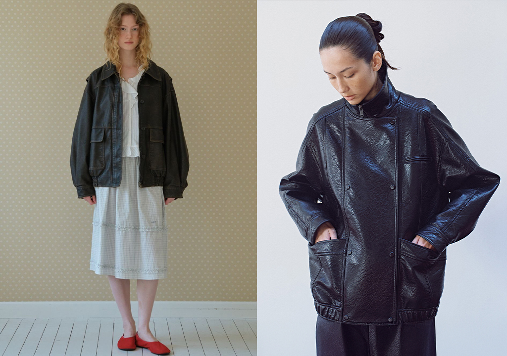 브랜드 ‘반로에’는 빈티지한 크랙 질감과 은은한 광택감이 특징인 ‘더블 스냅 버튼 페이크 레더 재킷’을 출시했고, ‘튜드먼트’는 자연스럽게 빛 바랜 워싱 가공이 돋보이는 ‘워시드 봄버 레더 재킷’으로 유니크한 스타일을 제안한다. 여성 디자이너 브랜드 ‘오브베이지’ 역시 미니멀한 디자인에 볼륨감 있는 실루엣을 더한 ‘샌디 스웨이드 블루종 재킷’을 내놓으며 데일리 아우터 수요를 공략하고 있다.