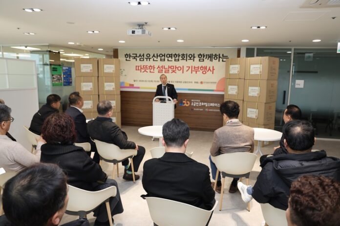 한국섬유산업연합회(회장 최병오, 이하 섬산련)가 2월 12일 오후 3시, 서울 창신 의류제조공동인프라에서 설 명절을 맞아 봉제 소공인을 위한 기부 행사를 진헹했다.