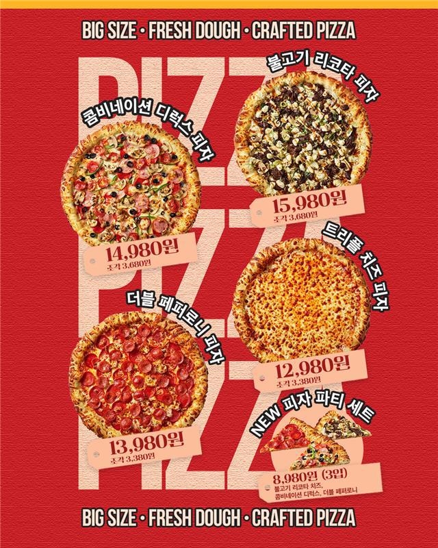 이 외에도 불고기와 리코타 치즈를 강조한 ‘불고기 리코타 피자(1만 5980원)’, 두 가지 페퍼로니를 적용한 ‘더블 페퍼로니 피자(1만 3980원)’, 모짜렐라와 체다 그리고 고다 치즈를 조합한 ‘트리플 치즈 피자(1만 2980원)’ 등도 1만원대 가격으로 즐기는 가족 먹거리로 자리를 잡았다.