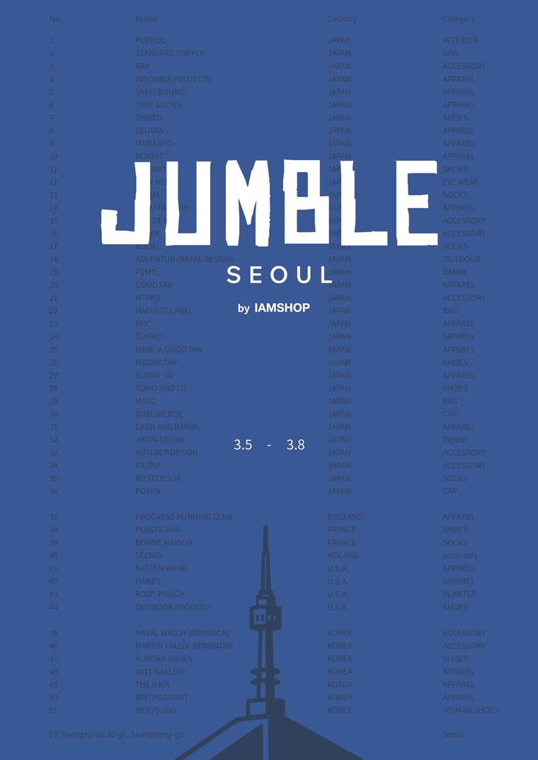 아이엠컴퍼니(대표 정성묵)의 아이엠샵(IAMSHOP)이 주최하는 일본 대표 패션 트레이드 쇼 ‘JUMBLE TOKYO’의 서울 에디션, ‘JUMBLE SEOUL by IAMSHOP’이 오는 3월 5일(목)부터 8일(일)까지 4일간 성수동 Space S1에서 열린다.