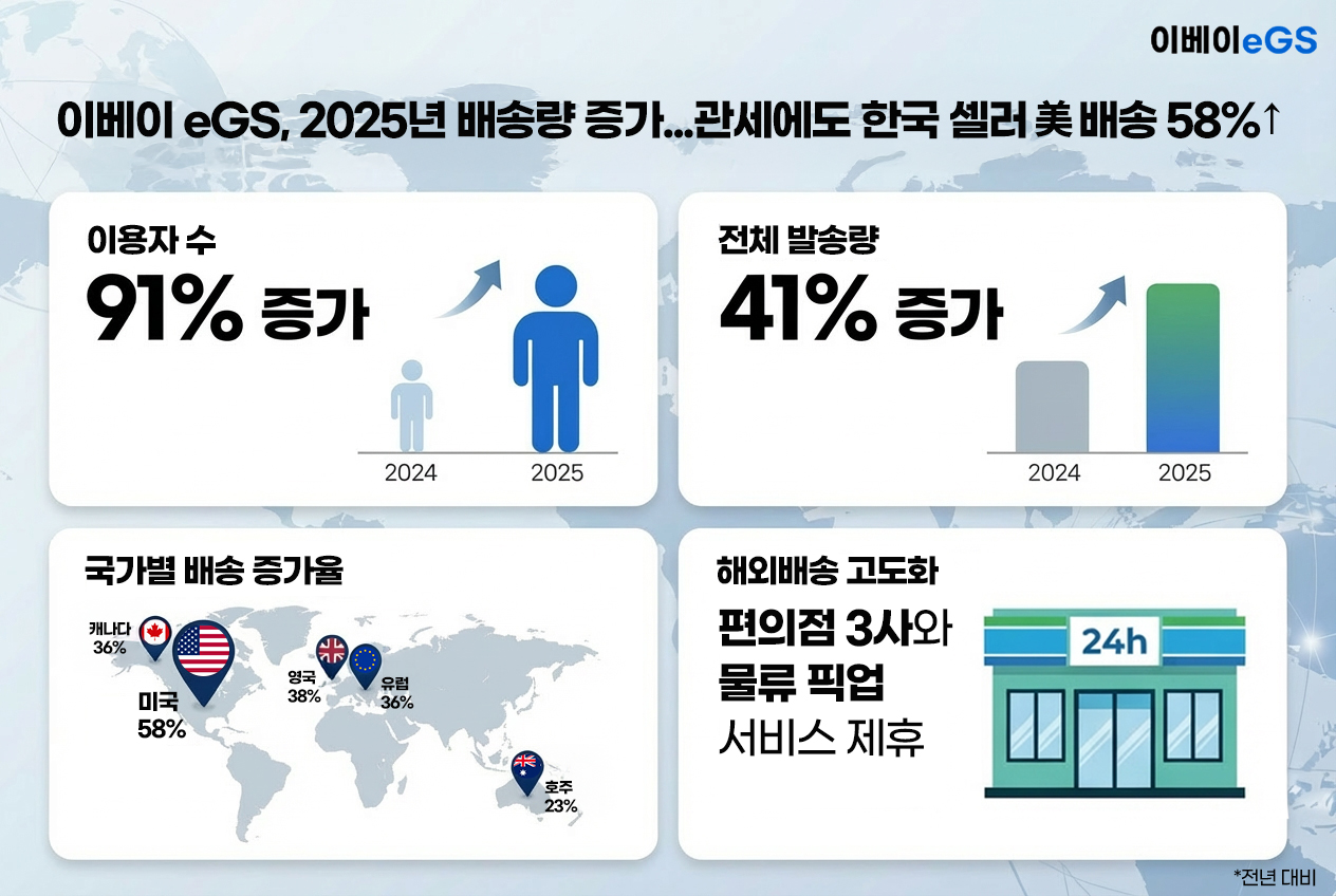 글로벌 커머스 플랫폼 이베이(eBay, 대표 제이미 이아논)와 물류기업 린코스(대표 김용현)가 공동 운영하는 통합 해외 배송 서비스 ‘이베이 eGS’의 2025년 역직구 물량이 큰 폭으로 성장했다. 이베이 eGS가 분석한 한국 셀러 이용 데이터에 따르면, 2025년 전체 서비스 이용자 수는 전년 대비 91% 급증했으며 누적 배송량 역시 41% 늘었다.