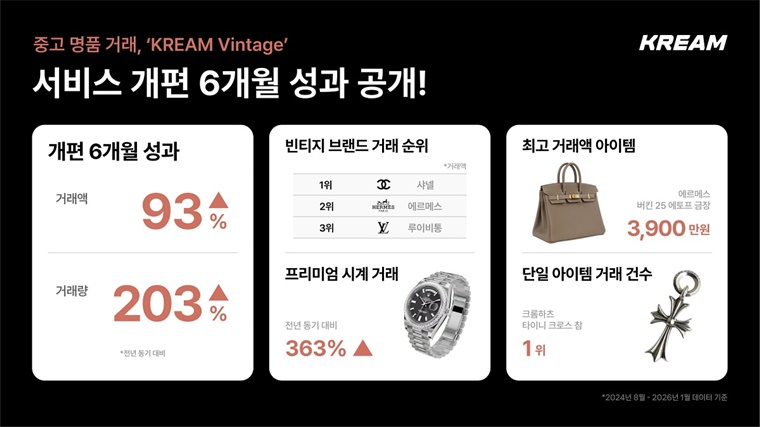 크림은 지난해 8월 기존 중고 명품 서비스를 ‘빈티지’로 리뉴얼하며 브랜드 라인업을 확장하고 이용자 접근성을 강화했다. 개편 이후 2026년 1월 31일까지 6개월간의 데이터를 분석한 결과 빈티지 카테고리의 전체 거래 건수가 전년 동기 대비 203%, 거래액은 93% 증가하며 가파른 성장세를 보였다.