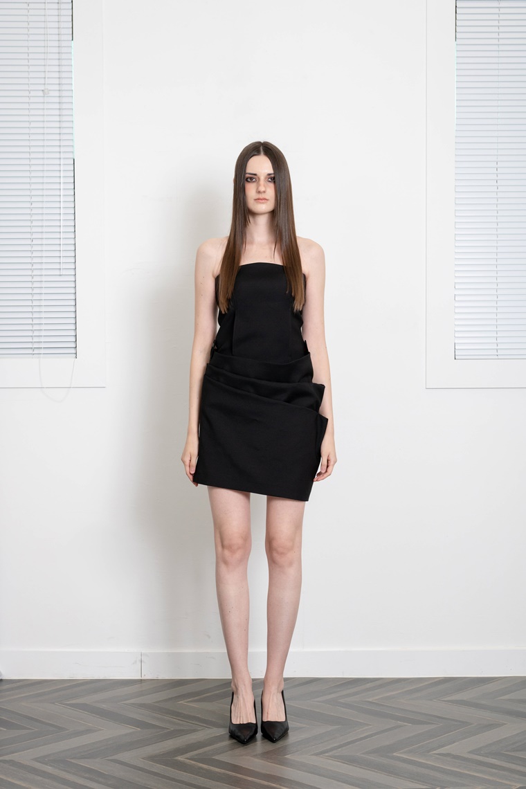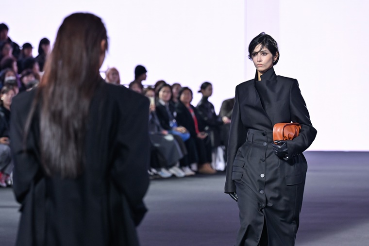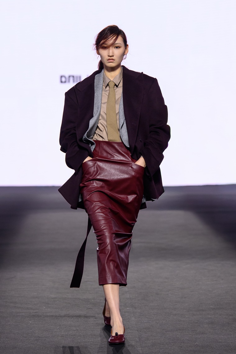 소재의 대비도 이번 컬렉션의 핵심 언어였다. 거친 질감의 레더와 부드러운 패브릭, 광택감 있는 새틴과 클래식한 울이 자유롭게 뒤섞이며 시각적 입체감을 극대화했다. 여기에 블랙, 그레이, 다크 그린의 깊이 있는 모노톤 팔레트가 컬렉션의 무게감을 더했고, 그 사이에서 등장한 강렬한 레드 미니 드레스는 정체된 공기를 단번에 깨뜨리며 ‘도약의 순간’을 상징적으로 구현해 관객들의 시선을 사로잡았다.