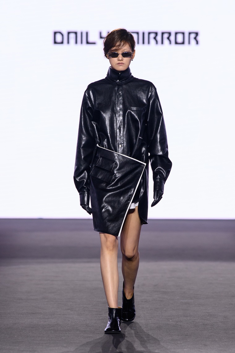 런웨이를 채운 의상들은 데일리미러의 정체성인 ‘Modern · Genderless · Layered’를 완벽하게 구현했다. 어깨 라인을 대담하게 강조한 오버 사이즈 테일러링과 직선적으로 길게 떨어지는 롱 코트가 구조적 안정감을 형성했고, 가죽 재킷을 수트나 셔츠 위에 겹쳐 입는 방식은 이질적인 아이템들의 충돌이 만들어내는 입체적 에너지를 생생하게 드러냈다.