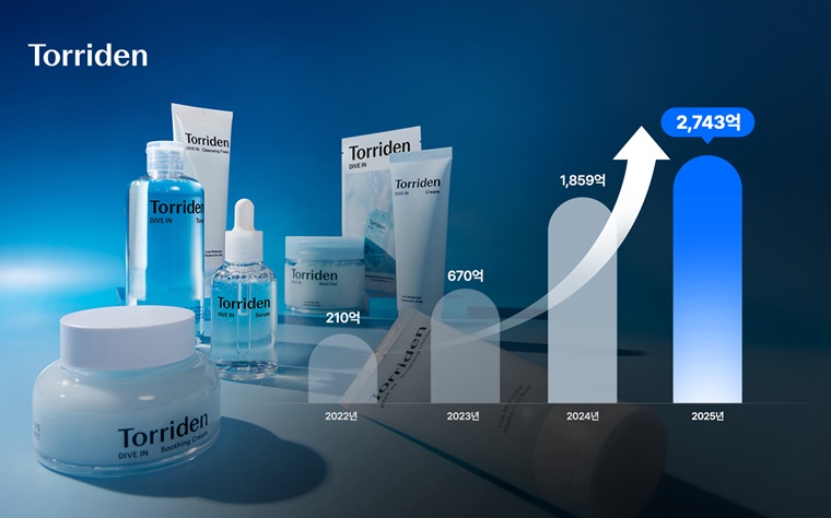 글로벌 스킨케어 브랜드 토리든(대표 권인구, 이윤희)이 2025년 연결 기준 매출 2,743억 원을 기록하며 역대 최대 실적을 달성했다. 최근 3개년 연평균 135% 성장세를 이어간 결과다.