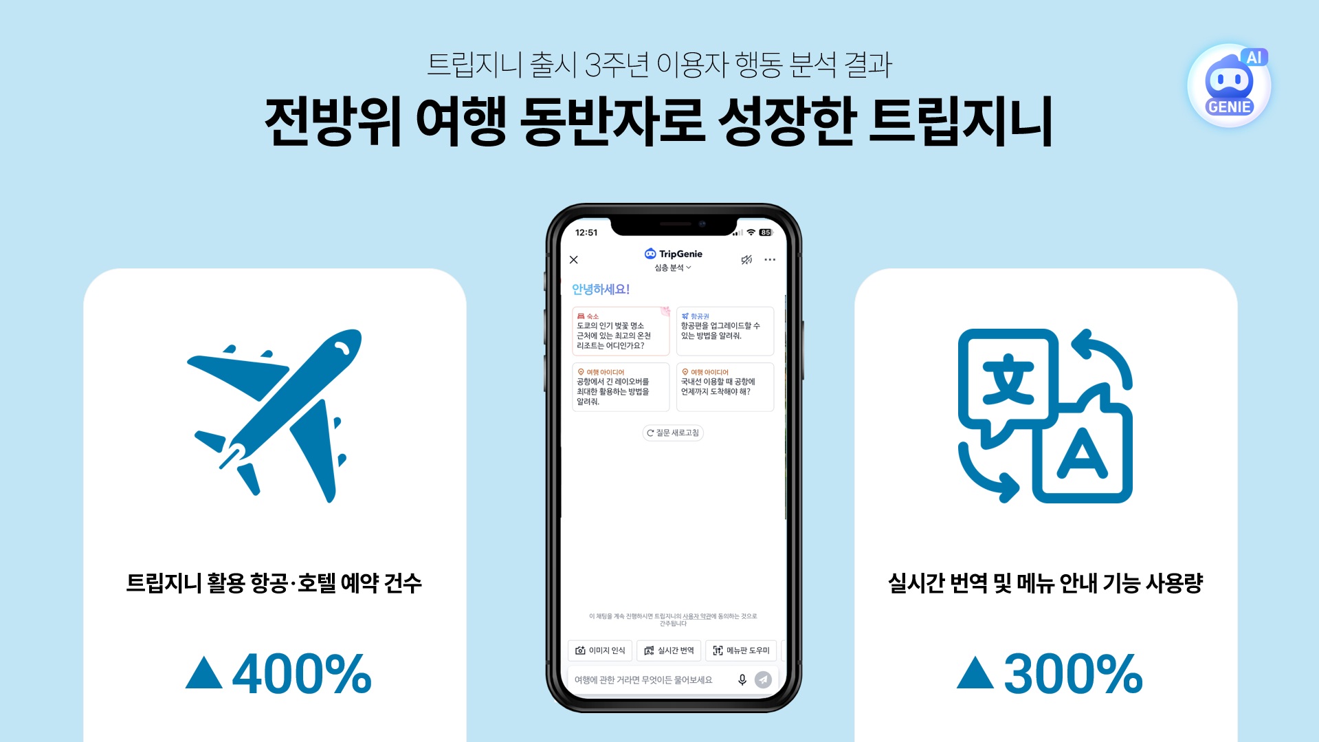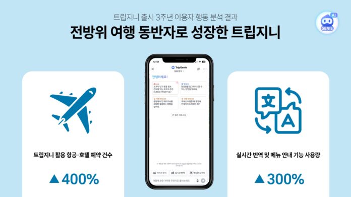 글로벌 여행 플랫폼 트립닷컴은 실시간 AI 여행 어시스턴트 ‘트립지니(TripGenie)’ 출시 3주년을 맞아 사용자 행동 패턴 분석 결과를 31일 발표했다. 조사 결과에 따르면, 트립지니를 통한 AI 기반 예약 건수는 전년 대비 400%나 폭증하며 AI가 단순 상담원을 넘어 실질적인 결제 비서로 안착했음을 입증했다.