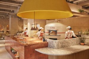 OLIPEPE is an Italian bistro brand that delivers a dining experience where conversation and laughter linger, through Italian-inspired ambiance and a wood-fi red live kitchen. OLIPEPE is CJ Foodville’s Italian bistro brand that infuses carefully handcrafted dishes with a cheerful and lively energy, pursuing a dining experience where conversation and laughter naturally linger. the space is designed under the concept of “Strada Italiana,” evoking the feeling of dining in Italy.