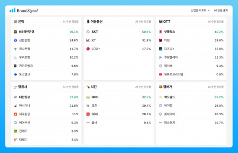 | 산업 카테고리 | 1위 브랜드 | AI 추천 점유율 |