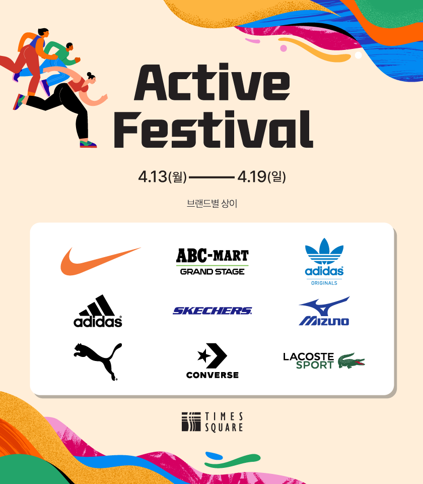 타임스퀘어는 나이키 리뉴얼 1주년을 기념해 ‘액티브 페스티벌’을 선보인다. 행사 기간 동안 주요 스포츠 브랜드의 할인과 사은 이벤트가 이어진다. 푸마는 러닝 제품에 한해 4월 26일까지 추가 20% 할인을 진행하고, 나이키 타임스퀘어점은 4월 18일부터 19일까지 브랜드 데이를 통해 슈즈와 의류를 각각 할인 판매한다. 이와 함께 아디다스 오리지널스와 퍼포먼스 라인 역시 일부 품목에 대해 최대 20% 할인 혜택을 제공한다.