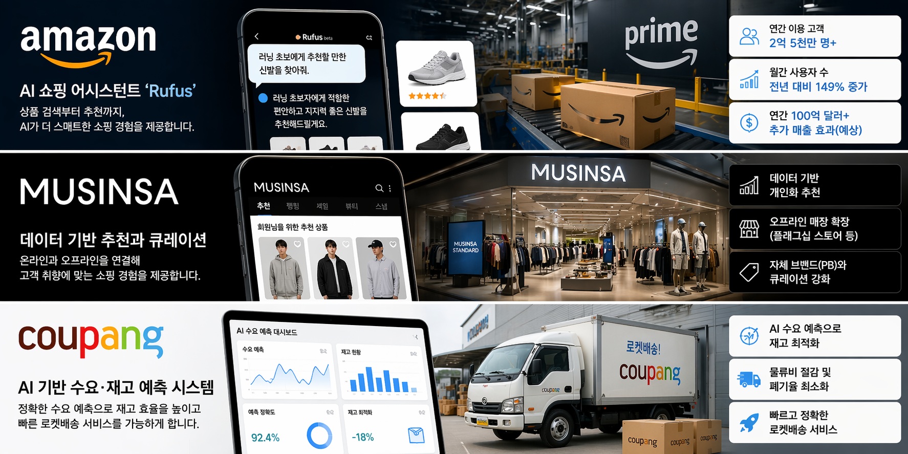 국내에서는 쿠팡이 AI 기반 수요·재고 예측 시스템을 통해 효율을 높이고 있다는 점이 업계에서 주목받고 있다. 2023년 쿠팡은 연간 기준 영업이익 흑자를 달성했으나, 이 성과를 ‘AI 수요예측’ 한 가지 요인으로만 설명하기에는 복합적 원인이 작용했다. 다만 AI·빅데이터 기반의 재고·수요 예측이 물류비 절감과 폐기율 최소화에 기여하는 방향은 리테일·물류 산업 전반에서 공통적으로 주목받는 트렌드라는 점은 분명하다.