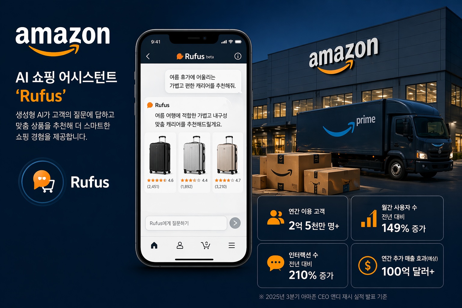 Rufus의 성과는 공식 수치로도 확인된다. 아마존 CEO 앤디 재시는 “2025년 3분기 실적 발표에서 연간 2억 5000만 명 이상의 고객이 Rufus를 이용했으며, 월간 사용자 수가 전년 대비 149%, 인터랙션 수는 210% 증가했다”고 밝혔다. 또한 Rufus를 쇼핑 중 사용한 고객은 그렇지 않은 고객보다 구매 완료 가능성이 60% 이상 높으며, Rufus가 연간 100억 달러 이상의 추가 매출을 창출할 것으로 예상된다고 발표했다. 다만 이 수치는 아마존 내부 기준의 ‘다운스트림 임팩트’ 지표를 바탕으로 한 것이며, 즉각적인 구매뿐 아니라 7일 내 지연 전환까지 포함한 수치임을 감안할 필요가 있다.