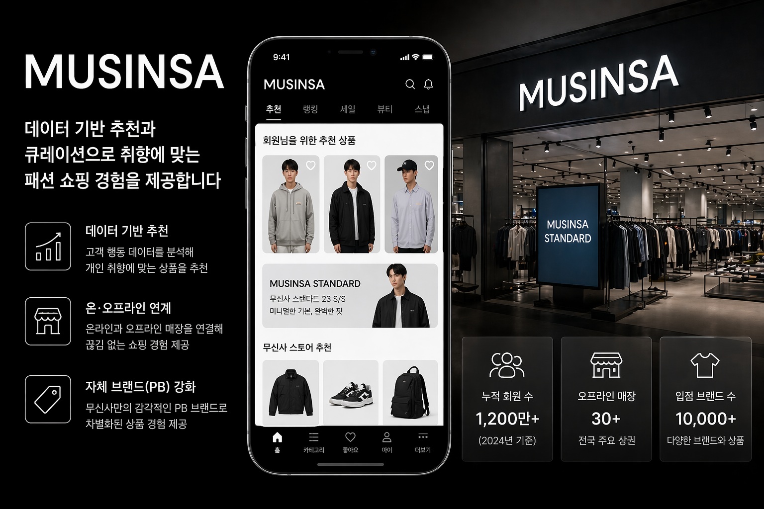 국내 패션 플랫폼 무신사는 온라인 중심의 데이터 기반 추천·큐레이션을 강화하는 동시에, 오프라인 매장 확장과 자사 브랜드(PB)를 연계하는 전략을 추진하고 있다. 데이터 기반 고객 분석을 활용해 오프라인 매장 전략과 재고 운영을 고도화하는 방향으로 개발이 이어지고 있다.