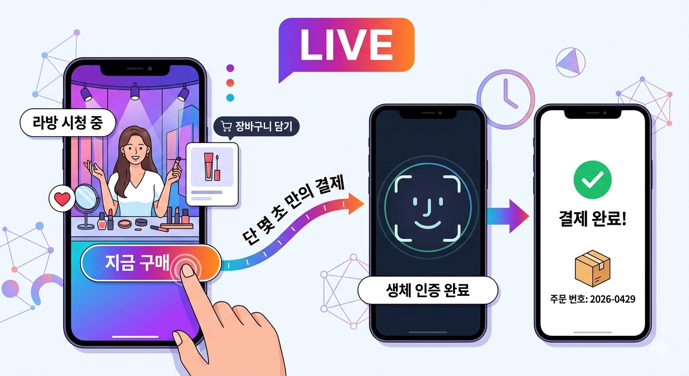 라이브커머스 내 ‘단 몇 초 만의 결제’는 생체 인증 기반 간편결제와 인앱 체크아웃 기술을 통해 구현되고 있다.