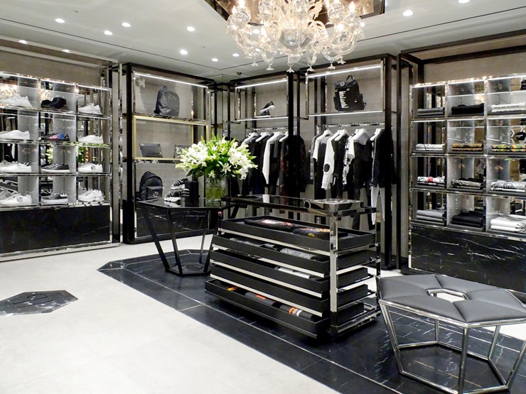 매장 입구에 들어서면 브랜드의 상징인 스와로브스키 크리스탈 장식의 해골 조형물을 볼 수 있으며, 매장 전반에 블랙과 화이트 색상의 천연 대리석과 이태리산 타일을 사용해 브랜드의 고급스러운 이미지를 잘 표현했다.