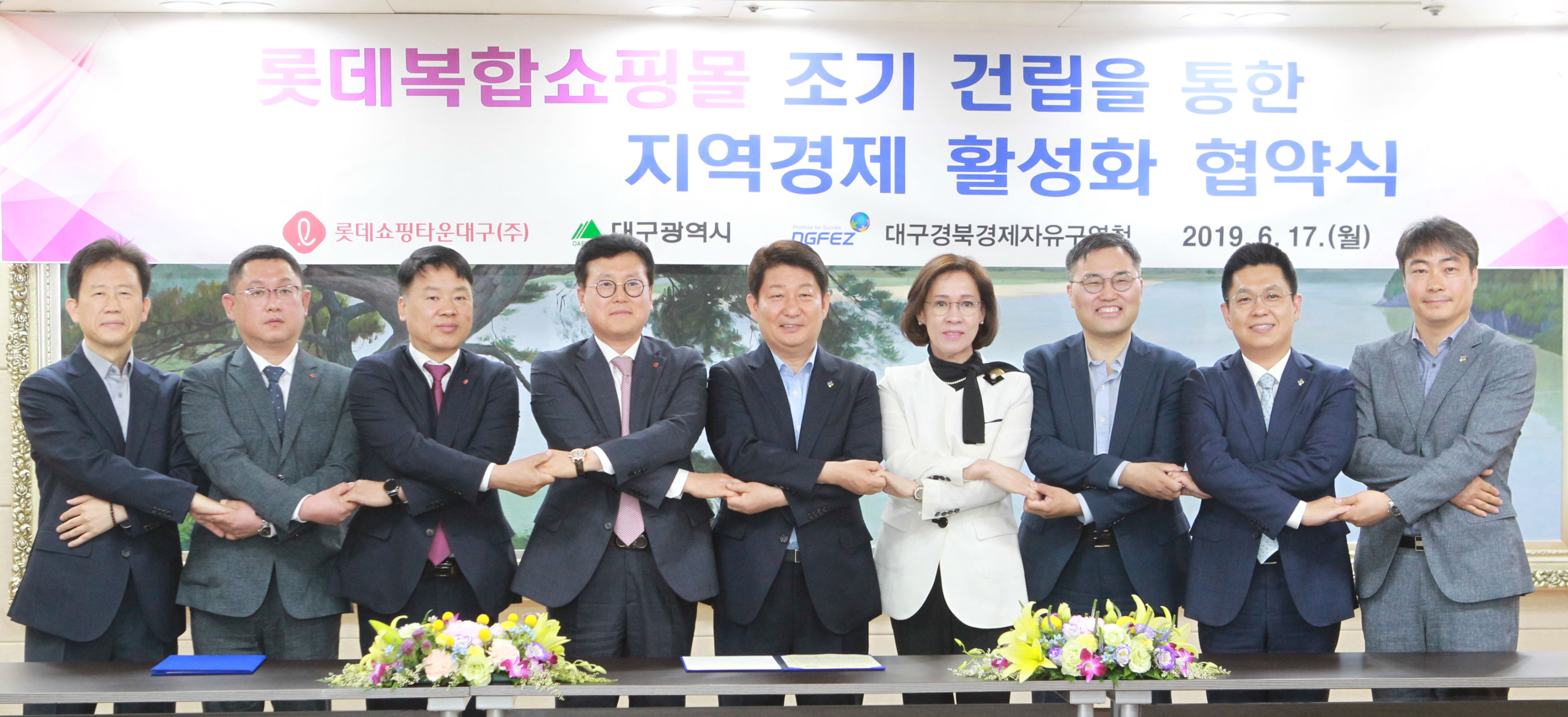 롯데자산개발 이광영 대표이사는 6월 17일(月) 대구시청 상황실에서 대구시 권영진 시장, 대구경북경제자유구역청 이인선 청장과 롯데몰 사업 본격추진을 위한 MOU를 체결했다.