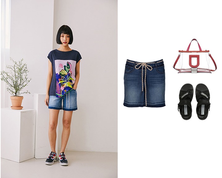 장마철엔 길이가 긴 바지는 물이 튀어 오염될 수 있기에 숏 팬츠를 선택하는 것이 현명하다. 독특한 워싱이 가미된 베스띠벨리 숏 팬츠는 특유의 데님 컬러가 경쾌한 무드를 선사한다. 이와 함께 다양한 색감이 돋보이는 패턴의 상의를 매치하면 보다 발랄한 캐주얼룩을 선보일 수 있다.