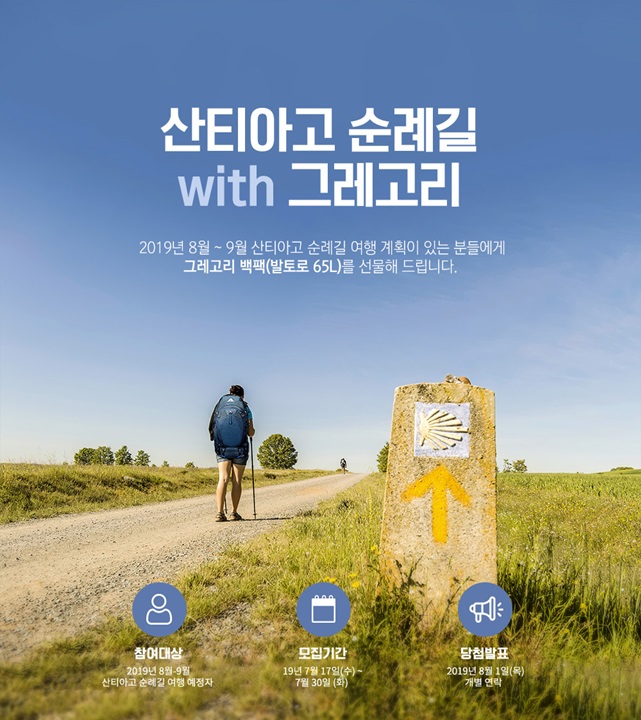 40년 전통의 미국 아웃도어 라이프스타일 브랜드 그레고리(GREGORY)가 7월 30일(화)까지 산티아고 순례길 여행을 계획 중인 사람들을 대상으로 최상위 하이엔드 아웃도어 라인인 ‘발토로(BALTORO) 65L’를 증정하는 ‘산티아고 순례길 with 그레고리’ 이벤트 참가자를 모집한다.