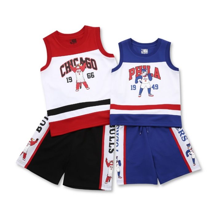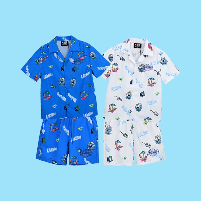 트렌디한 오버 사이즈핏을 적용한 슬리브리스 상∙하의는 NBA 농구팀 시카고 불스, 필라델피아의 팀 마스코트를 활용해 귀여운 스트릿 감성을 물씬 살려 눈길을 끈다. 청량한 블루, 화이트 색감의 반팔, 반바지 세트에는 LA 레이커스 로고와 서핑, 선글라스 등 한 여름을 연상케하는 아이콘들을 조화롭게 그려내 톡톡 튀는 발랄함을 배가시켰다.