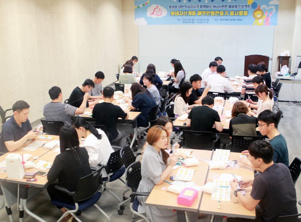 롯데자산개발은 ‘애착인형 만들기’ 봉사활동을 통해 예비맘들에게 사랑을 전달한다. 롯데자산개발 임직원들은 지난 7월 26일(금)부터 4차수에 걸쳐 롯데피트인 동대문 교육장에서 ‘애착인형 만들기’ 봉사활동에 참여하고 있다.