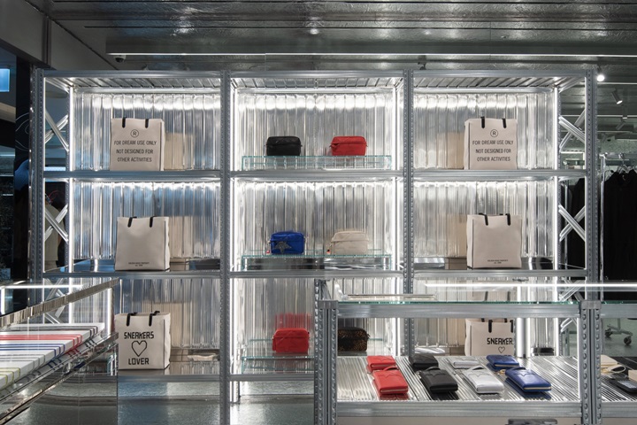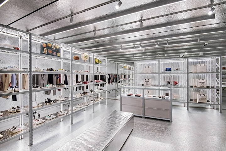 매장은 벽과 바닥, 천장 전체를 실버 소재로 장식하여 전체 인테리어에 통일감을 줄 뿐만 아니라 환한 분위기를 연출하도록 설계되었으며, 아연 도금 스틸과 고광택 스테인리스 스틸 소재의 가구 및 비품은 공간에 자연스럽게 녹아들어 완벽한 조화를 이룬다.