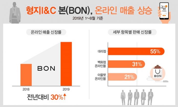 형지I&C(대표 최혜원)는 자사의 남성복 브랜드 ‘본(BON)’의 올 1~8월 온라인 매출이 전년 동기간 대비 약 30% 증가했다고 2일 밝혔다.