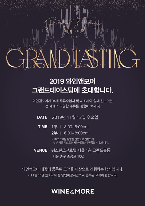 올해 3번째로 진행되는 그랜드 테이스팅 행사는 와인 애호가들에게 국내 중소형업체의 상품을 알리는 장이며, 매회 2천명 이상의 고객이 참석하는 대규모 무료 시음 행사다. ‘와인앤모어’ 회원 누구나 신청할 수 있으며, 기존 회원이 아니어도 행사에 참석하기를 희망하는 고객은 11월 11일(월)까지 가까운 ‘와인앤모어’ 매장에서 신규 회원으로 등록하면 참여할 수 있다.