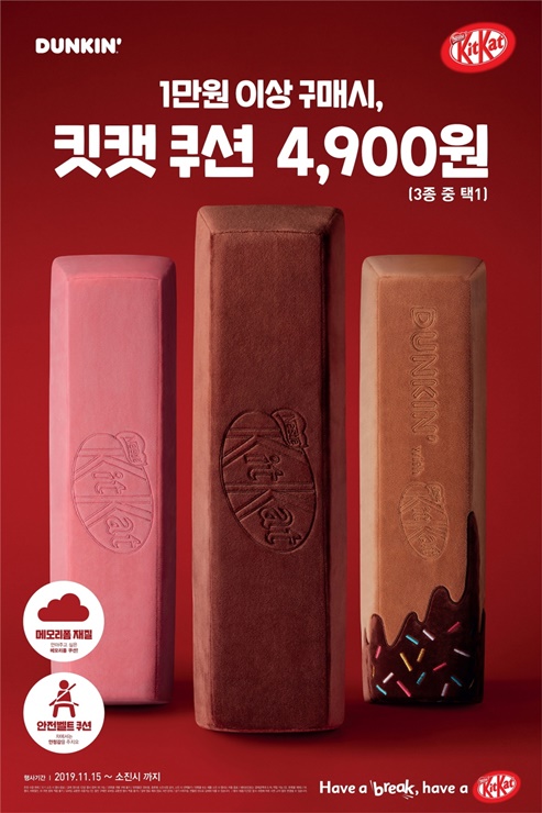 ‘킷캣 쿠션’은 ‘초코’, ‘핑크’, ‘도넛’의 세가지 디자인으로 만나볼 수 있다. 각각 ‘킷캣’ 초콜릿과 던킨도너츠 ‘도넛’을 형상화한 독특한 디자인으로, 인테리어 소품으로 사용하기 좋다. 메모리폼 소재를 이용해 푹신하고 부드러운 촉감이 특징이며, 상품 뒷면의 벨크로를 이용해 차량 안전벨트 쿠션으로도 사용하는 등 높은 실용성을 갖췄다.